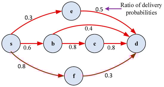 The selection of intermediate potential candidate nodes with ETX and EAX metrics is shown in Figure 1. It can be observed that source node , destination node d, and next-hop neighbor nodes b, e, and f of node c possess a different ratio of delivery probabilities. The ETX metric selects all three neighbor nodes such as , , and because paths from these nodes to have smaller ETX values than that from to . These three neighbor’s nodes are sorted in ascending order based on the ETX value obtained by using Equation (10). On the other hand, the EAX select only two nodes, such as b and e, because with these two candidates, the EAX from to is less than the EAX from to , adding to the candidate set does not decrease EAX between and . Furthermore, EAX prioritizes node b over node e as it possesses a smaller value of EAX based on Equation (11). Next hop selection comparison between ETX and EAX potential intermediate candidate’s selection and prioritization from source to destination nodes by ETX and EAX is illustrated in Table 1.