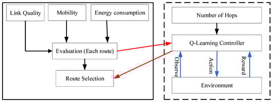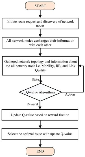 Lastly, based on the expression, next-hop node which has higher Q-value is selected for the optimal route. The flowchart of MRLAM routing scheme shown in Figure 3 describes the process of selection of optimal route from source to destination based on Q-learning algorithms. The MRLAM routing scheme selects the optimal route applying decision policy-based Q-learning algorithms, which can effectively reduce the redundant information in the network topology and enhance overall network performance. The route selection based on mobility, residual energy, and link quality with the Q-Learning algorithm is described below: