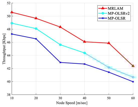 The throughput performance of the MRLAM, MP-OLSR, and MP-OLSRv2 routing schemes with increasing node speed shown in Figure 4 indicates that the MRLAM scheme constantly provides acceptable and better throughput performance than the MP-OLSR and MP-OLSRv2 routing schemes in all scenarios of node speed. Higher throughput achieved through the MRLAM scheme is indicative of the mobility awareness consideration factored in during the optimal route selection process, whereas the other two routing schemes do not consider mobility awareness, especially when a link failure occurs as a result of high node’s mobility. The MP-OLSR routing employs route recovery and loop detection, while the MP-OLSRv2 employs the topology sensing and route computation mechanism for the selection of an intermediate node in the route. These mechanisms need to transmit extra packets in the network when the route is established, which lead to reduce number of packets received at the destination at the particular time period. The route selected by the MRLAM scheme usually has lower mobility or more energy level than other routes; therefore, the link is more stable and ultimately experiences very few packet drops, which in turn maximizes the throughput. The link failure of nodes in MRLAM routing is estimated by using ETX and EAX parameters. Based on the values of these parameters, the proposed routing scheme diverts the packet flow toward the intermediate nodes which have better link quality. As the node speed increases, the number of link breaks with MRLAM remains lower than MP-OLSR and MP-OLSRv2 routing schemes and accordingly, the throughput decreases constantly. Throughput decreases from 47.39 kbps to 39.87 kbps for MP-OLSR, from 49.17 kbps to 40.87 kbps for MP-OLSRv2, and from 50.86 kbps to 42.63 kbps for MRLAM when the node speed varies from 10 m/s to 60 m/s respectively. The proposed routing scheme selects the route based on the status of link quality metric, which reduces the number of transmissions and increases channel utilization efficiency upon which reliable link is selected. This, in turn, increases the throughput of the whole network. Compared with the other schemes, critical analysis of the simulation results demonstrates that MRLAM scheme clearly performs better when it comes to selecting intermediate nodes that are more qualified in terms of low mobility, energy level, and link quality. As a result, the route recovery process invokes less frequent link failure; therefore, improved overall network throughput is achieved.