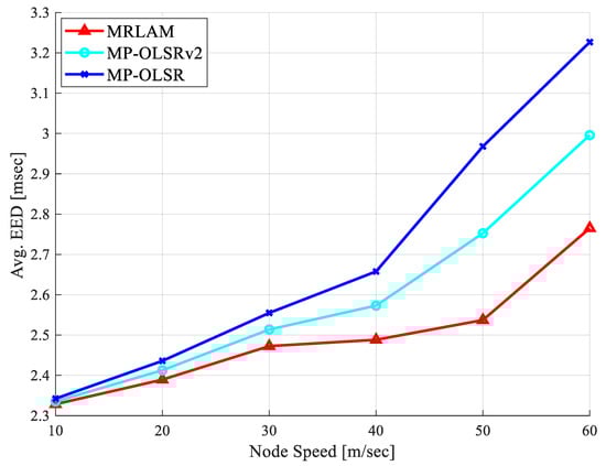 Figure 5 illustrates the end-to-end delay comparison of the MRLAM, MP-OLSRv2, and MP-OLSR routing schemes with a variation of node speed between 10 m/s and 60 m/s. It can be seen from the figure that all the schemes show almost similar results when the node speed is till 30 m/s. As the node speed increases from 40 m/s, the end-to-end delay of the conventional MP-OLSR and MP-OLSRv2 routing schemes substantially increases. It is due to the fact that both routing schemes do not consider mobility awareness factor of intermediate nodes in the selection of an optimal route, which leads to increased delay at high-speed node scenarios. The MP-OLSR and MP-OLSRv2 routing schemes select the intermediate nodes based on the multiple node-disjoint and link disjoint metric cost functions, respectively. Therefore, these routing schemes forward packets through a longer route from source to destination, that induces propagation and transmission delays in the network. Moreover, MRLAM scheme maintains and controls end-to-end delay by exploiting EAX metric that minimizes the number of intermediate nodes and number of retransmissions required for reliable packet’s delivery on optimal route. The MRLAM utilizes pause time and moving time factor for mobility estimation of nodes from the RWP model. Therefore, it stabilizes the dynamic network to effectively deliver the packet with less time. In addition, using the Q-learning algorithm, the MRLAM selects the intermediate nodes which have low mobility and better link quality when determining the best path from available alternate paths for forwarding data packets toward the destination that leads to minimized end-to-end delay. Overall, it can be observed that MRLAM reduces the end to end delay by approximately 15% and 10% compared to MP-OLSR and MP-OLSRv2 routing schemes, respectively, at 60 m/s node speed.