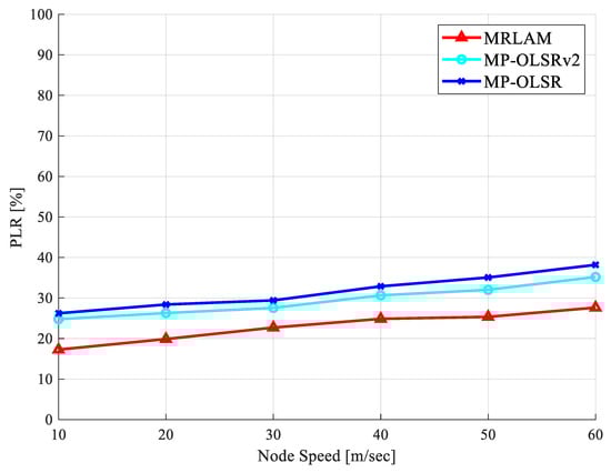 The MRLAM routing scheme maintains a PLR less than 30% for all scenarios of node speed which is a significant performance improvement for efficient data transmitted in MANETs environment. These results attribute the effectiveness of the proposed scheme to selection of optimal route synchronized with Q-learning process for multiple parameters during the route establishment process. The Q-learning algorithm provides higher rewards to the node which has better link quality with a neighbor node, which reduces the chances of frequent link failure and increases the successful delivery probability of packets. The MRLAM scheme exploits EAX that decreases the number of intermediate nodes in the selection of optimal route, the impact of which reduces the number of dropped packets during data transmission. In addition, EAX decreases the number of trials for data retransmission and reduces link failure probability resulting from the dynamic nature of networks, thereby keeping a lower PLR than other multipath schemes. In establishing a reliable route, the MRLAM scheme avoids the nodes which change their positions frequently and quickly exhaust their battery power. For high-speed node scenarios, it can be seen from Figure 6 that MRLAM scheme achieves better performance compared to both routing schemes, and the improvement percentages are approximately 30.76% and 24.59% compared to MP-OLSR and MP-OLSRv2, respectively.