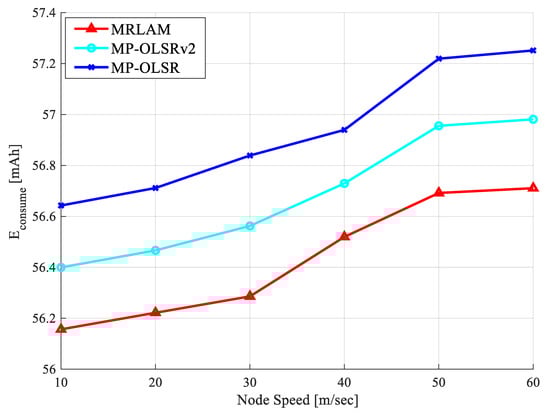 Comparison of node energy consumption during operation time of the network is shown in Figure 7. The result shows that MRLAM performs better than the other routing schemes in terms of energy consumption during path establishment and in exchanging routing topological information as it selects intermediate nodes based on low EAX value for probe messages. Moreover, it has already been established that MRLAM selects the path with less chances of link failure, resulting in lower energy consumption as it forwards data packets toward destination node. If effect, the Q-learning technique provides high rewards value to the nodes which have lower energy consumption, thereby enhancing energy utilization during data transmission. However, as the node speed increases, the energy consumption of nodes increases. Energy consumption increases from 56.67 mAh to 57.26 mAh for MP-OLSR, from 56.43 mAh to 56.926 mAh for MP-OLSRv2, and from 56.15 mAh to 56.72 mAh for MRLAM approximately, when the node speed increases from 10 m/s to 60 m/s. Overall, it can be observed that MRLAM has less energy consumption rating than MP-OLSR and MP-OLSRv2 scheme because the source node forwards traffic flow towards intermediate nodes which have the highest level of energy as opposed to its counterpart routing schemes.