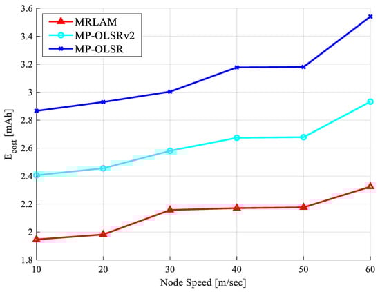 Simulation results for energy cost per packet are shown in Figure 8, the proposed routing scheme attains lower energy cost due to the node selection mechanism it employs which select only the nodes with highest energy level. Displacement of intermediate nodes in the path causes the variation of energy levels of nodes whilst increasing mobility. The MRLAM scheme also selects nodes with better link quality and lower speed to decrease energy consumption and packet loss ratio, this awareness is not used in the other routing protocols. The increase in a node’s movement in the network increases the complexity of network topology for sensing and route computation process. However, the proposed MRLAM routing scheme takes advantage of utilizing Q-learning algorithm along with minimum energy consumption node for transmission packets that helps to reduce the energy cost as well as complexity of the network. The Q-learning algorithm periodically updates the state-action value with learning rate based on energy consumption of intermediate nodes as well as the number of packets transmitted and received. Moreover, there is reduced network packet flooding and energy cost of packets forwarded to the destination in MRLAM scheme compare with the other schemes. From the perspective of the overall node speeds, critical analysis of the simulation results shows a decrease in energy cost by 33% and 23% as compared to the MP-OLSR and MP-OLSRv2 routing schemes, respectively.