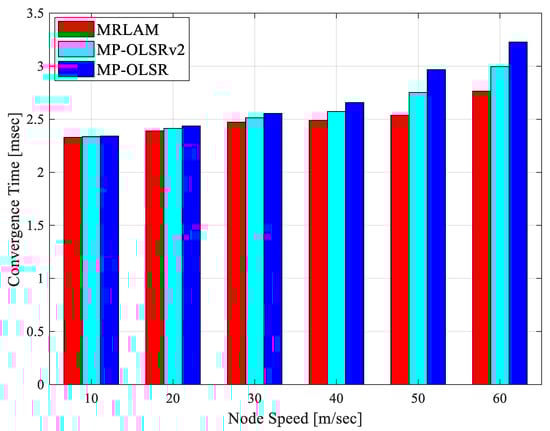 The convergence time for all routing schemes is depicted in Figure 9. It can be seen from the figure that all the schemes show similar results when the node speed is up to 30 m/s. As the node speed increases to 40 m/s, the convergence time of the conventional MP-OLSR and MP-OLSRv2 routing schemes substantially increases. This because other routing schemes select the longer path from source to destination nodes based on the link cost function and multiple disjoint metrics, while the MRLAM chooses the shortest path with more stable nodes and better links which reduces data packet transmission delay. In addition, the MRLAM routing scheme utilizes the mobility and link quality status of the mobile nodes, which leads to minimizing the frequent change of network topology. Meanwhile, it uses the Q-learning algorithm which quickly updates the routing information of the network with any changes occurring in the network, and this reduces the convergence time of the network. In the MRLAM routing scheme, fewer intermediate nodes need to converge, thus the load on any given node or communication link is minimized. Therefore, it reduces the calculating costs of intermediate nodes of the paths and improves communication efficiency. Overall, at the node speed of 60 m/s, the proposed MRLAM routing scheme recorded the lowest convergence time of 16.49% and 11.34% in comparison to the MP-OLSR and the MP-OLSRv2 routing schemes, respectively.
