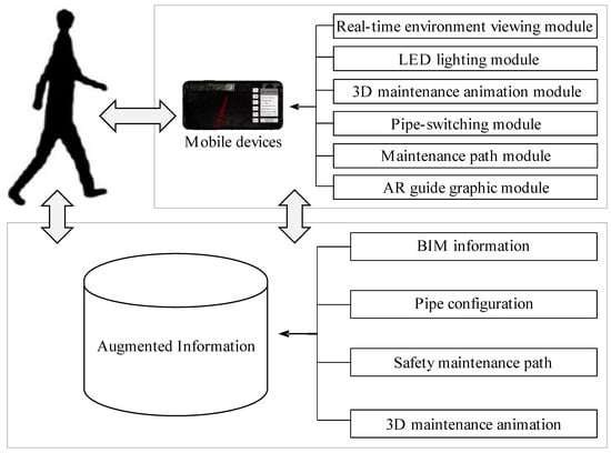 One of the major AR characteristics is the combination of real and virtual objects in a real environment [,]. The combination show a strong resemblance to that of building system maintenance, which constitutes the completion a complicated task by applying knowledge of various levels and representative forms. The diversity of mechanical equipment in building system maintenance requires hands-on experience and a thorough comprehension of the appropriate operation manuals in order to perform maintenance jobs at real sites. In addition to BIM, a task normally has to be carried out with support or resources from different fields, which possess the diverse characteristics of as-built realty, facility management, operational instruction, and working environments that could either be difficult to access or have complicated cross-space layouts throughout the entire building.