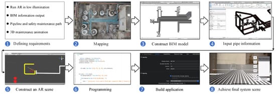 The development process of BARMS is illustrated in Figure 2. After defining the system requirements, the 3D BIM model and related pipe information were constructed. The 3D pipe model was imported into Unity to create the AR scene. The final app was built in Xcode to code for different functions and corresponding links. An unmanned aerial vehicle (UAV), DJI Spark, was used as a measurement and drafting assistant for the 2D plan and the 3D model of the building. The BIM pipe model was constructed using Autodesk Revit. Visual Studio was utilized to code the program.