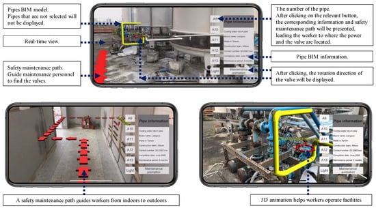 The traditional architectural design of facilities requires that maintenance workers refer between plumbing layout drawings and the actual facilities in complex, hidden, sealed in-wall, or low illumination environments. The purpose of a Building information modeling-based Augmented Reality Maintenance System (BARMS) in this study was to provide a smartphone-based platform and a new application scenario for cooling tower and pipe shutdown protocol in a real-world old campus building. An intelligent instruction framework was built considering subject, path, and actions. Challenges and solutions were created to monitor the subject and maintenance protocol while moving from inside to outside, between bright and dark environments, and when crossing building enclosures at roof level. Animated instruction using AR was interactive and followed the knowledge and management protocols of associated instruction aids. The results demonstrated a straightforward mapping of in-wall pipes and their connected valves, with practical auxiliary components of walking direction and path guidance. The suggested maintenance routes also ensured a worker’s safety. Statistical analysis showed a positive user response.
