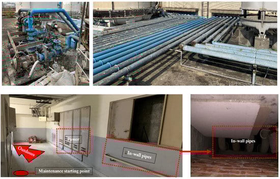 The following situation, system, and location specify the conditions under which BARMS was applied. The roof had a total of 10 cooling towers, 20 pipes, and a number of integrated valves (Figure 4). Pipes entered the walls of the staircase near the ground level to reach the floors below and the condensers in the basement. The cooling tower and the power panel were located outside and inside the building, respectively. In the event of an indoor leak, the maintenance worker had to determine which pipe was broken, its corresponding outdoor location, and its connected power switch on the roof level by traveling between the indoors and outdoors several times to confirm a correct match. Due to the lack of sufficient lighting devices in open air, maintenance in the evening was more difficult than that performed in the daytime.