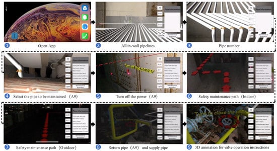Screen shots of BARMS utilization are shown in Figure 7. Upon running the app, all of the regional pipes were displayed, including in-wall and downward-extending ones. The pipes were marked by 3D numbers, such as A9, A10, or A11. The tester could tap on a certain pipe number to hide unrelated pipe information. Meanwhile, the location of the power switch connected to the cooling tower and pump was indicated by a moving 3D arrow to attract the tester’s attention. After turning off the power switch, the tester could walk to the corresponding cooling tower and valve by following the safe maintenance route displayed on the screen. Moreover, tapping the “Maintenance Animation” button would bring up an animated arrow around the valve showing the correct rotation direction to shut down the pump. A video sample of the test can be seen in Appendix A.