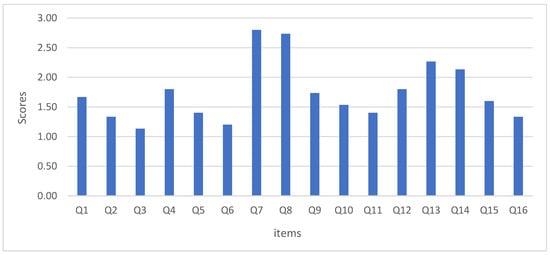 The questionnaire was revised on the basis of the Post-Study System Usability Questionnaire (PSSUQ) (Appendix B). The PSSUQ has four dimensions with a total of 16 assessment items, including 1–16 items for the “overall average”, 1–6 items for “system usefulness”, 7–12 items for “information quality”, and 13–15 items for “interface quality” (Table 1). The questionnaire items were scored on a Likert-type seven-point scale, where 1, 2, 3, 4, 5, 6, and 7 were represented by “strongly agree”, “agree”, “somewhat agree”, “neutral”, “somewhat disagree”, “disagree”, and “strongly disagree”, respectively. Essentially, the lower the rating the higher the system’s reported usability. Table 1 shows the feedback from the PSSUQ. The overall average, system usefulness, information quality, and interface quality scores were 1.74, 1.42, 1.90, and 2.00, respectively, showing high system usability []. Figure 8 shows more detailed scoring. Questions 7 and 8 scored relatively high because BARMS did not provide a way to correct system errors. Although there were no obvious errors in the system during the test, it was a function that the testers thought could be provided in the future. Other suggestions included adding more text to instruct the user’s actions and more screen buttons for system options.