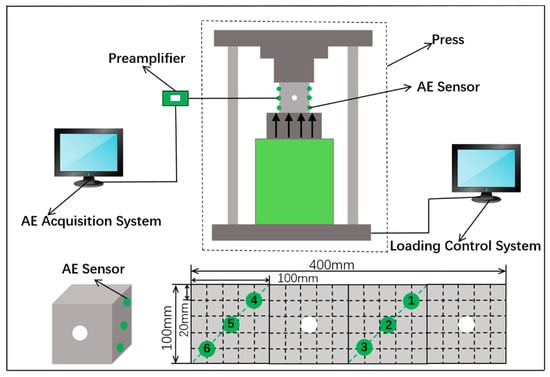 The experimental system mainly includes a loading system and an AE acquisition system (Figure 2). The loading system is a new YAW-4306 type electro-hydraulic servo pressure testing machine (mistras, MTS - SANS Shenzhen Operations, Shenzhen, China) by which mainly composed of an oil pump and a control system. The control system consists of DCS controller and Power Test software (Version 3.3; MTS—SANS Shenzhen Operations, Shenzhen, China), and can realize multiple functions such as force control, displacement control and force retention with up to 300,000 yards’ resolution and ±1% relative error. The maximum load of the compressor oil pump can reach 3000 kN. Experimental system can do experiments such as stretching loading, uniaxial loading, grading loading, cyclic loading and unloading.