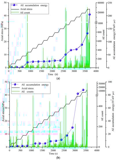 It can be seen from Figure 3a that in the initial stage (0–9 MPa) of the staged loading of the intact sample, the AE count and the energy value are small due to the higher strength of the granite sample and the lower internal crack closure. As the grading loading progresses, the internal compactness of the sample increases, and the original fissures become fewer and fewer. At the same time, the stress level is insufficient to generate new fissures, so the AE count and energy show a slight downward trend. As the stress continues to increase, when the stress is in the rising phase of 9–12 MPa, the AE signal has a high value response and then the sample enters into the elastic phase (12–32 MPa). At this time, micro-cracks begin to be generated inside the sample, and the generation of new fissures is relatively random but the number is relatively stability, while the cumulative energy of AE is also in a relatively stable phase. When the stress is in the rising phase of 30–33 MPa, the AE signal jumps again, for the sample from the elastic phase into the plastic phase (33–45 MPa), and begins to be irreversible deformation. Meanwhile, the micro-crack gradually expands and forms a small regional fracture and nucleation, which leads the AE count and energy all show a significant upward trend and significantly exceeded the first two stages. The cracks also expand and close with the increase of time in the force retention phase, the AE count and the cumulative energy rise faster, and the rheological characteristics of the sample become more and more obvious due to loading damage factors. When the sample reaches the damage fracture limit stage (42–45 MPa), the internal crack of the sample penetrates a lot and forms the main macro-crack, the AE count increases rapidly to the maximum value. When the stress level reaches retention phase (46 MPa), the sample completely cracks and destabilizes, the AE counts and energy increase rapidly and reach a maximum.
