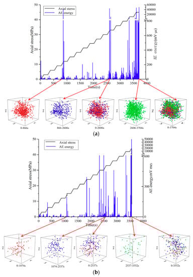 Time-space response of AE energy during damage of granite samples. (a) intact sample; (b) holey sample.