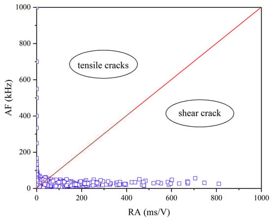 As an effective means of damage assessment, AE is often combined with resistivity, electromagnetic radiation, ultrasonic and other non-destructive testing methods to evaluate the damage of structures and materials. There are two main ways to judge the crack type: firstly, the parameter method, i.e., judging the internal fracture mode of the sample in accordance with RA value and AF value (RA = rising time/amplitude, AF = ringing count/duration). Studies indicate that AE signals with low AF and high RA values usually represent the generation or development of shear cracks, while high AF and low RA values represent the generation or development of tensile cracks. Secondly, quantitative inversion of moment tensor, i.e., achieving the properties, volume, spatial orientation and other parameters of the micro-crack after solving moment tenser by the first wave amplitude of six different spatial position sensors. However, this method is relatively complex due to involvement of the calibration test or deconvolution process of the sensor before the experiment as well as containment of the solution of the dynamic green functions. In this paper, the AE parameter method is used to study the relationship between the spatial distribution pattern of micro-cracks and its properties. Taking the pore rock as an example, the AE signal observation value during the rupture of the sample is shown in Figure 5, and the crack types over different spatial distributions according to the AE localization results are shown in Figure 6.