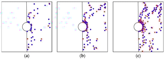 It can be seen from Figure 5 that the fracture modes during the damage of the sample are tensile and shear composite crack and are mainly composed of tensile cracks. Take the right half of the hole rock as an example for analysis. As the stress increases, the crack spatial distribution is as shown in Figure 6. The tensile crack is indicated by a blue circle, and the shear crack is indicated by a red square.