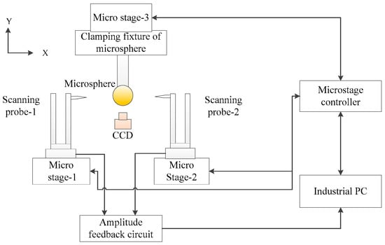 The principle of the proposed microsphere measurement system is demonstrated in Figure 1. In this system, a measured microsphere made of ruby is clamped with a clamping fixture, and the fixture is assembled on a micro stage (Micro stage-3). The line profile of the microsphere in the maximum cross section is scanned simultaneously and differently with two scanning probes (scanning probe-1 and scanning probe-2). During the measurement, the microsphere moves along the Y direction (as shown in Figure 1) via micro stage-3, and the two probes move along the X direction separately and oppositely driven by micro stage-1 and micro stage-2. After one of the cross-sectional profiles is scanned, the microsphere is rotated by the rotary stage with a predetermined degree, such as 30°, and a new profile of the cross section is scanned. Two CCD cameras are installed on the top (This one is not shown in Figure 1) and front of the microsphere to confirm the visual alignment.