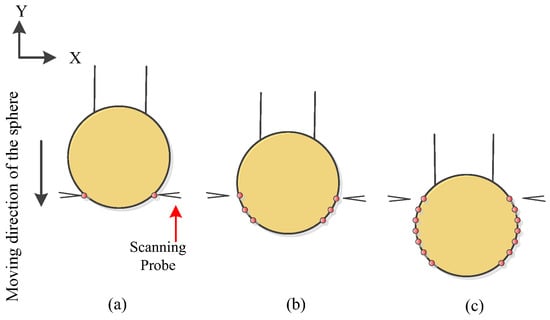 The schematic of the measurement process is shown in Figure 2, where a maximal cross-sectional profile of the microsphere is scanned. Figure 2a illustrates the initial position of the measurement process. After one two-point measurement is completed, probes move away from the microsphere in the X direction. Afterward, the microsphere moves down to a new position along the Y direction, and two probes move toward the microsphere to perform a new two-point measurement (Figure 2b). Figure 2c provides the complete result of a maximal cross-sectional profile of the microsphere. After the measurement of one cross-sectional profile is completed, the microsphere is rotated by rotary stage, and another cross-sectional profile can be scanned. By the same way, several cross sections of the microsphere can be measured. The dimensions of the microsphere can be fitted after integrating the data of the multi-sections.