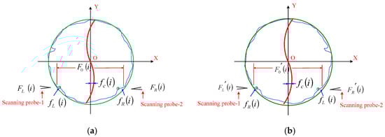 Figure 3a shows the measurement principle of a cross-sectional profile, is the measurement data of scanning probe-1, is the measurement data of scanning probe-2, is the assumed true value of the chord length, and are the morphological errors at left and right, is the yaw error, i is the index of measurement positions. After the measurement of the profile circle shown in Figure 3a is completed, the microsphere is turned with the angle of 180 degrees, and the opposite cross-sectional profile can be measured. The measurement principle of the opposite profile is shown in Figure 3b, is the measurement data of scanning probe-1, is the measurement data of scanning probe-2, is the assumed true value of the chord length of the opposite circle. For the two opposite circles, the measurement results of the two probes can be expressed as: