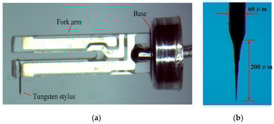 Figure 4 illustrates the structure of the scanning probe, which is constructed with a quartz tuning fork and a tungsten stylus. Figure 4a,b present the photos of the scanning probe and the tungsten stylus, respectively. The tungsten stylus is made of a tungsten wire with a diameter of 60 μm through electrochemical polishing. The effective length of the tungsten stylus can reach 150–200 μm, and the diameter of the stylus tip is about 20–50 nm. The stylus is long and sharp enough to scan the microspheres with diameters of several hundred microns.