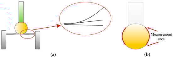 In this study, the diameter of the measured microsphere ranges from tens to hundreds of micrometers. According to the scanning strategy shown in Figure 2, a structural interference may occur between the probe tip and the microsphere when the bottom area is scanned because the surface of the microsphere has a large curvature, especially near the bottom (the lower position of the microsphere in Figure 2). Figure 5 shows the structural interference between the probes and the microsphere. The bottom area of the microsphere is omitted during scanning to avoid the influence of the interference (Figure 5b).