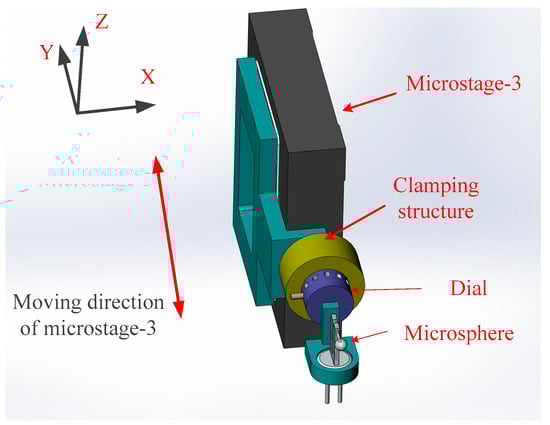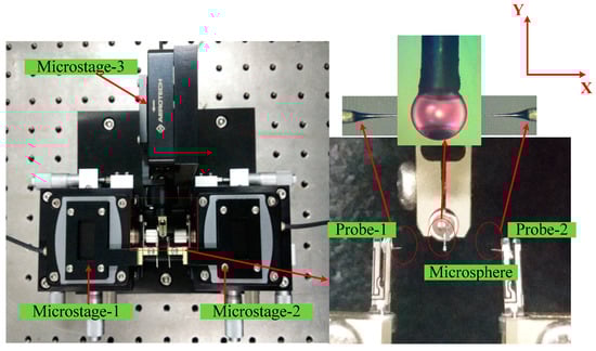 Among the three micro stages produced by Aerotech Inc, Pittsburgh, PA, USA. The stages in the X and Y directions are QNP-50-250L and QNP-60-500L, respectively. The strokes of the stages in the X and Y directions are 250 and 500 μm, respectively. During the measurement, the micro stages are set to work in a closed-loop mode, and the closed-loop control of the stages is conducted with their built-in piezoelectric actuators and capacitance sensors. The corresponding driving resolutions of the stages under the closed loop in the X and Y directions are 0.5 and 0.9 nm, respectively. The pitch and yaw errors of the stages in X and Y directions are 1.2 and 2.5 arc sec, respectively. The position errors of the stages are tiny, the linearity of the stages in X and Y direction are 0.01 and 0.007 percent of the motion displacement, and the bidirectional repeatability errors of the stages in X and Y direction are 1 and 3 nm, respectively. The displacement range of the stage in the Y direction ensures that the microsphere with a diameter of less than 500 μm can be fully measured. The micro stages in X direction are installed on two separate 3D macro platforms, which have strokes of ±6.5 mm in the X and Y directions and 10 mm in the Z direction.