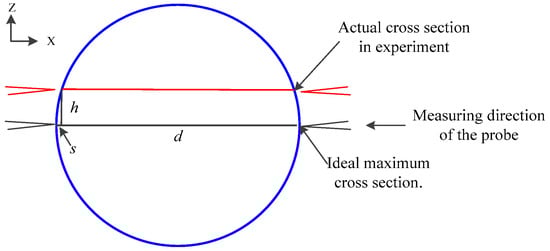 In Figure 9, d is the diameter of the sphere, h is the offset distance between the ideal maximum cross section and the actual cross section in the experiment, and s is the alignment error caused by h. The formula for h is: