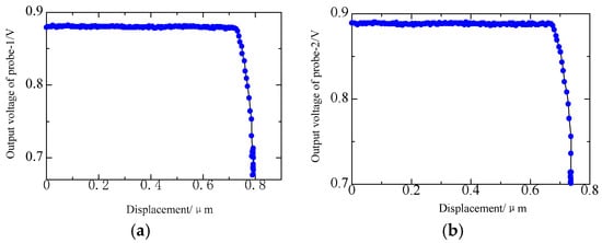 The output voltage of the probe is a linear function of its vibration amplitude. In Figure 10, the slope rate of the decreased part is the sensitivity of the probe, that is, the slope rates of probe-1 and probe-2 are about 7.3 and 8.1 V/µm in the vertical direction, respectively.