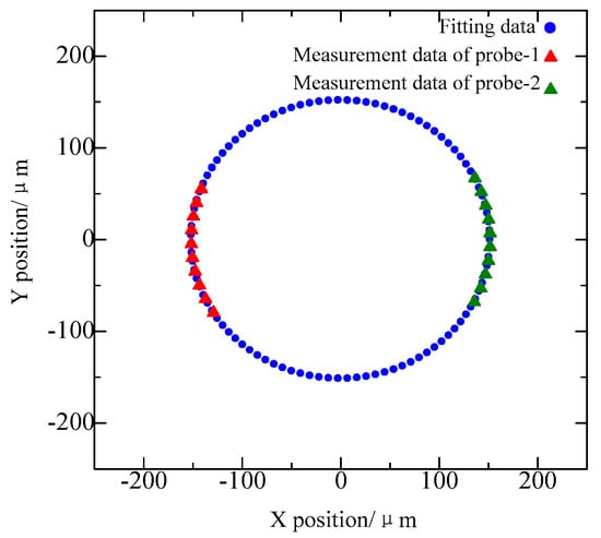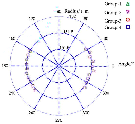 The data from the two probes are fitted separately by the least-squares method to obtain their respective centers. A coordinate transformation is conducted to make the centers coincide with each other. Thus, the data from the two probes can be integrated with a common center. Then this center is moved to the origin of the coordinate, and the least-squares fitting is implemented for the whole data to acquire the final result of the cross-sectional profile circle. Normally, the shape of the cross section circle is very smooth, and the error in the integration process of the two centers is very small and can be neglected. The experiments are repeatedly performed (four times) to verify stability and repeatability (Figure 13). The standard deviation of the repeatability of a single measurement position is 15.1 nm.