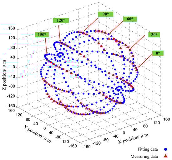 As the same measurement procedure of the maximal cross-sectional profile mentioned above, the other five maximal cross-sectional profiles are measured. The intersection angle of any two adjacent sections is 30°, and the six maximal cross-sectional profiles are evenly distributed on the microsphere. Figure 14 shows the measuring data (red solid triangle) and the fitted data (blue solid dot) of the cross-sectional circles.