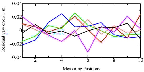 The principle of the alignment error is demonstrated in Figure 9, where the offset distance between the ideal maximum cross section and the actual cross section can be controlled within about 1 μm. The measured diameter is 303.643 μm. According to the principle in Figure 9, the standard deviation of the calculated alignment error is 2.2 nm. The linearity of micro stage-3 is 0.007 percent of the motion displacement estimated based on the technological manual, which is about 9.5 nm. After eliminating the yaw error, the residual errors of the measured six cross-sectional profiles are shown in Figure 15. The residual yaw errors of the measured six cross-sectional profiles are fluctuated within −31.9–26.5 nm, and the standard deviation of the residual yaw is 12.9 nm.