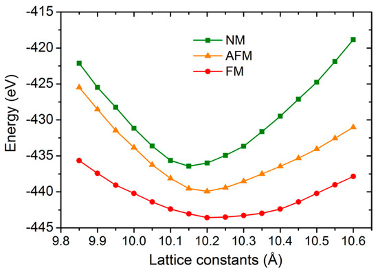 In order to obtain the theoretical equilibrium lattice constant and the ground state properties of GaFe(CN)6, we constructed supercells based on experimental structural parameters and calculated the total energy of ferromagnetic (FM), non-magnetic (NM), and antiferromagnetic (AFM) states of GaFe(CN)6 under different lattice constants. The ground state is determined based on the principle that the lower the energy is, the more stable the structure is. The total energies of GaFe(CN)6 in FM, NM, and AFM states are drawn in Figure 2. Obviously, FM states have lower total energy than NM and AFM states, which means the ferromagnetic state is the most stable for GaFe(CN)6. The equilibrium lattice constant obtained at the same time was 10.1883 Å. This result is slightly larger than the experimental result, and the deviation is 1.23% compared with the experimental result, which is within a reasonable range. The coordinates of the positions of the atoms in the equilibrium state of GaFe(CN)6 are also listed in Table 1. Excepting that the x coordinates of C and N atoms deviate from the experimental data, the other results are consistent with the experimental values.