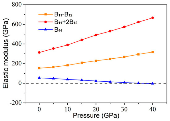 The P in the formula above refers to the external pressure. The curves of B11 − B12, B11 + 2B12, and B44 with pressure are plotted in Figure 4. B11 − B12 and B11 + 2B12 increase with the increase of pressure, and also meet the mechanical stability criterion under pressure. When the pressure is greater than 35 GPa, the value of B44 is negative, and the stability condition of B44 is not satisfied. Generally speaking, when the external pressure of GaFe(CN)6 is less than 35 GPa, its mechanical performance is stable. Once the external pressure exceeds 35 GPa, the mechanical performance of GaFe(CN)6 is unstable.