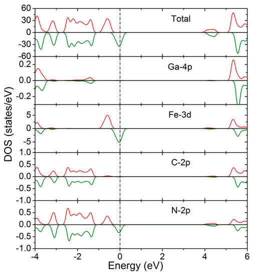 The projector augmented wave (PAW) [41] method encoded in the software Vienna Ab initio Simulation Package (VASP) [42] was performed during the calculations. The generalized gradient approximation (GGA) of the Perdew–Burke–Ernzerhof (PBE) functional is used as exchange correlation potential [43]. The electronic configurations—4s24p1 for Ga, 4s23d6 for Fe, 2s22p2 for C, and 2s22p3 for N—were treated as valence electrons in calculations. For the self-consistent calculation, the plane wave cutoff energy was chosen to be 400 eV. A mesh of 9 × 9 × 9 Monkhorst–Pack k-point was used. The convergence tolerances were selected as the difference in total energy and the maximum force within 1.0 × 10−5 eV and 1.0 × 10−2 eV/atom, respectively.