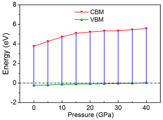 The electronic structure calculation of pressure from 0 to 40 GPa shows that the minority-spin direction of GaFe(CN)6 always shows metallic behavior. In this case, the physical properties of GaFe(CN)6 under pressure are basically determined by the majority-spin electronic states. Figure 7 depicts the CBM and VBM in majority-spin of GaFe(CN)6 as a function of pressure. With the increase of pressure, both CBM and VBM move towards high energy. Once the pressure is greater than 35 GPa, VBM will cross the Fermi level and make GaFe(CN)6 majority-spin also show metallic behavior. In this way, the half-metallicity of GaFe(CN)6 will disappear. It is worth noting that, as can be seen from Figure 7, the density of states across the Fermi level at 40 GPa is very low. This means that the material may not be able to hold enough free electrons and therefore has poor conductivity or metallicity.