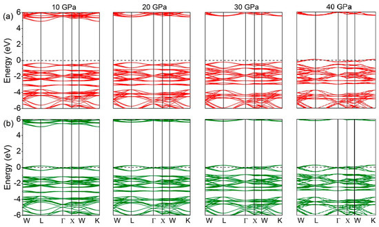 The effect of pressure on the electronic structure of GaFe(CN)6 can also be confirmed by Figure 8. In Figure 8, we can see that the minority-spin electronic states are hardly affected by external pressures. A slightly more obvious feature is that the conduction band in the high energy region moves toward a higher energy position as the pressure increases. However, this does not change the metallicity of the minority-spin direction. The electronic structure in majority-spin changes are consistent with the analysis in Figure 7. When the pressure is 40 GPa, the valence band in majority-spin crosses the Fermi level.