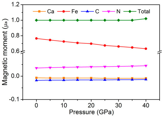At 0 GPa, the total magnetic moment per formula unit of GaFe(CN)6 is 1.0 μB, which is very consistent with the characteristic that the molecular magnetic moment of half-metallic magnetic materials is an integral value. The local magnetic moments of Fe, Ga, C, and N atoms are 0.765 μB, −0.007 μB, −0.018 μB, and 0.035 μB, respectively. Obviously, Fe atoms are the most important contributors to the magnetic properties of GaFe(CN)6. The local magnetic moments of Ga, C, and N atoms are very small. Because these three atoms have no magnetism, their magnetic moments are mainly induced by the influence of the Fe atom. In –Ga–N–C–Fe– chemical chains, the local magnetic moments between them show a sign change of −/+/−/+, which means that there is antiferromagnetic coupling between these atoms.