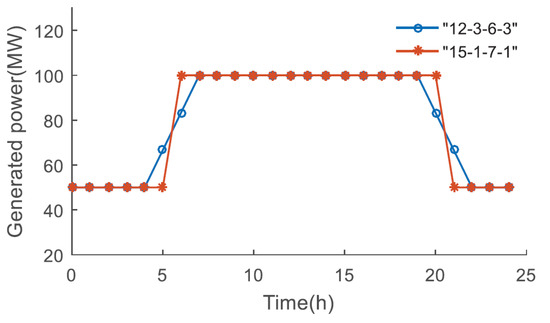 Nuclear power units participate in peak-shaving scheduling of the power system according to the output pattern of “12-3-6-3”. The peak regulation depth of two nuclear power units is set in advance at 30%.