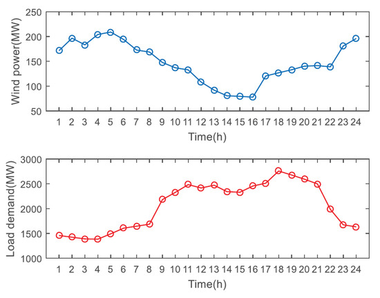The effectiveness of the proposed UC model is verified by the modified IEEE RTS-24 bus system, which consists of 10 thermal generation units, two wind farms, two nuclear power stations and two energy storage power stations. The cost coefficients of the generators are listed in Table 1 and Table 2. The daily load demand and wind power generation are shown in Figure 2. The quadratic function of the fuel cost and the constraints of minimum up/down time are linearized by reference to the literature [22]. The proposed UC mathematical model is solved with GAMS MINLP solver.