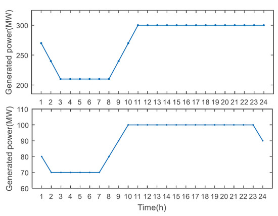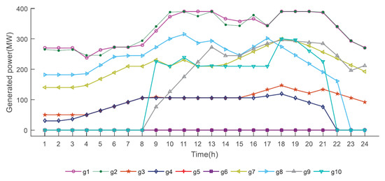 Considering the joint dispatching model presented, including nuclear generation, the optimized peak shaving depth of nuclear power is set to , The injected power and up/down status of 10 thermal power units are shown in Figure 4, where we can see that the No. 5 and No. 6 thermal power units (g5 and g6, respectively) are always in a stop state, which avoids the high up/down cost.