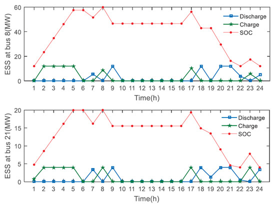 The optimized peak regulation output curves of the No. 1 and No. 2 nuclear power plants (h1 and h2) are shown in Figure 5, respectively. The output of nuclear generation follows the system demand, which effectively decreases the peak-valley load distinction. Figure 6 shows the charging and discharging active power of ESS on both bus 8, 21, and the total power at each time.