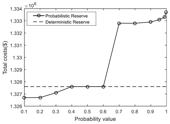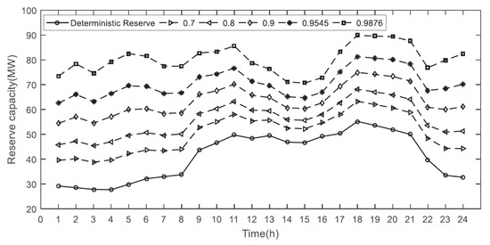 To capture different degrees of net power fluctuation, different confidence levels are set. Figure 7 shows the hourly deterministic reserve capacity in comparison with the probabilistic reserve constraint at various confidence levels. Besides, as shown in Figure 8, the overall cost rises with confidence level increasing.