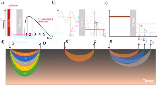 Schematic of the three NIRS detection modes. (a) TD-NIRS mode, an ultra-short light impulse is shined onto the tissue and the broadened and attenuated re-emitted pulse is measured after passing through the tissue. (b) FD-NIRS, a modulated (MHz) continuous light source is shined onto the tissues and the attenuated, phase shifted reemitted light is measured. (c) CW-NIRS, a continuous light is shined onto the tissues and the attenuated re-emitted light is measured. (d) Representation of the photon path in tissues for each technique. S: source, D: detector.