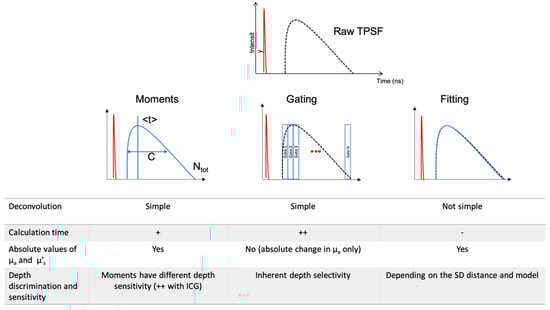 The DTOF acquired by the TD-NIRS systems contains information on the optical properties of the tissue and enables various data processing workflows to be used. Each method has its own strengths and drawbacks, in terms of computational cost accuracy, or need for a priori, as depicted in Figure 2. There are three main approaches for the data processing of TD-NIRS: the fitting approach, the moment calculation approach, and the gating approach (also called time gating or time windowing).