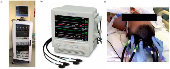 Example of homemade and commercial TD-NIRS instrumentation. (a) Homemade TD-NIRS system used in [], used with ICG. (b) The tNIRS-1 commercial system, from Hamamatsu (Japan), courtesy of Hamamatsu. (c) Example of probe positioning over both cerebral hemispheres of a patient (the system is the one illustrated in (a)). Extracted from [].