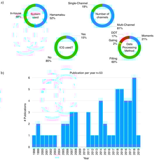Finally, Figure 4 summarizes the main characteristic of the TD-NIRS systems used in the reviewed publications and shows the number of publications over the last 20 years that report the use of TD-NIRS in a clinical context.