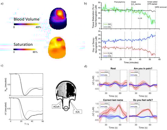 TD-NIRS could also be used to assess the adequacy of resuscitation. In a pilot study, Lanks and colleagues [] used a NIRO-TRS1 Hamamatsu system to monitor the cerebral saturation and haemoglobin concentration in 11 patients with septic shock, and compared those measurements with traditional markers of perfusion adequacy. In another study using the same system, Lanks and colleagues [] reported the case of a young man who suffered a pulseless electrical activity (PEA) arrest (i.e., cardiac arrest) while cortical oxygenation was monitored. The onset of cortical deoxygenation preceded the loss of palpable pulses for 15 min, despite otherwise stable measures of perfusion, reflecting falling cortical microvascular haemoglobin concentration and oxygenation minutes before PEA arrest. This result is presented on Figure 5b. Even though it is a single subject study, this suggest that TD-NIRS might provide the means of detecting PEA arrest, by monitoring cortical oxygenation.