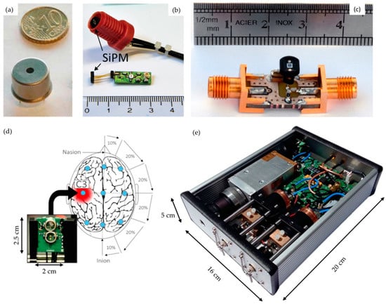 In recent years, a great deal of progress has been made in TD-NIRS instrumentation. One of the issues that has to be addressed is to reduce the footprint of the instruments, often considered as bulky. Indeed, even though current systems are useable in a clinical context, the current generation are often mounted on racks which are significantly larger than typical CW-NIRS systems []. Reducing the footprint of instruments is therefore crucial in a clinical context where space is limited. Figure 6 illustrates newly developed hardware that illustrates the miniaturisation of TD-NIRS hardware by showing recently developed elements like miniaturized laser sources or detectors [,] no larger than few millimetres. Using these newly developed components, a compact two channel, two wavelength system which fits in a box has been reported, as presented in Figure 6e []. This illustrates well the future possibilities of TD-NIRS with instrumental footprints comparable to CW-NIRS systems already used in the clinic. Moreover, these new components have the great advantage of being cheap, which will reduce the overall cost of a TD-NIRS system, facilitating even more its implementation.
