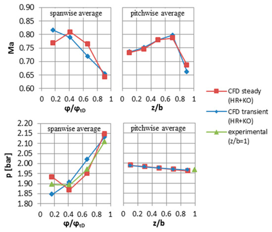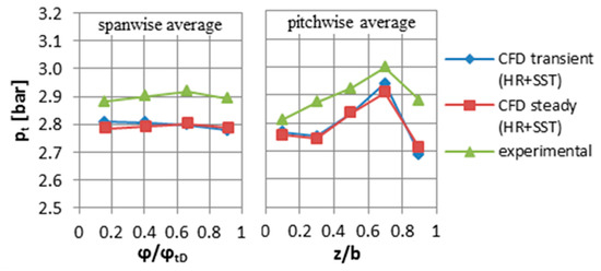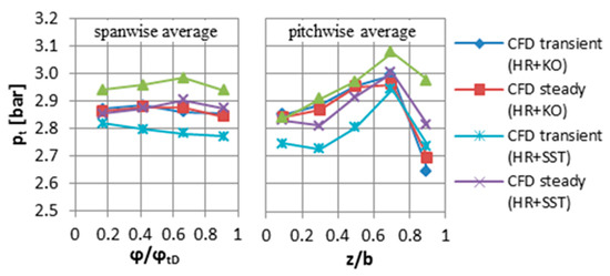The time-averaged quantities were compared to the corresponding values for the steady analysis and the experimental data. Figure 6 and Figure 7 show the pitchwise and spanwise distributions of pt for the operating points M and P1. The numerical and experimental data show the same trend, with a tendency of the numerical results to underestimate the total pressure values; the difference is comparatively small and reaches 10.9% at its maximum. In the case of P1 point (Figure 7), the total pressure is well-captured using the k-ω turbulence model for up to 50% of the span. The model results become less accurate moving near the diffuser front wall. In this zone (z/b = 0.7 and z/b = 0.9), characterized by a strong whirling flow, the SST simulations seem to provide a better matching with the test case reference values. The spanwise distribution of pt has a maximum at z/b = 0.7 for both the operating points M and P1, while the circumferential distribution is almost constant: potential flow effects do not influence the total pressure distribution, which is only determined by the impeller geometry and operating point (inlet conditions, rotational speed). The discussion of the z/b distributions needs a preliminary investigation on the contributions of static (p) and dynamic (dependent on Ma) components that make up the total pressure values. Only the simulation HR-KO will be considered for the point P1, because of its higher numerical stability and better coherence with the experimental data.