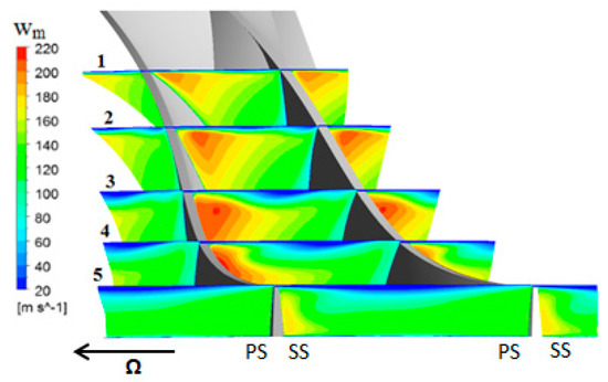 Figure 9 shows the meridional velocity contours at five hub-to-shroud sections of the impeller and Figure 10 presents the corresponding turbulent kinetic energy contours. At surface 1, the meridional velocity is clearly influenced by blade loading (with a faster relative flow at SS) and by different curvatures of the walls (which are the cause for the hub to shroud gradient). The meridional velocity distribution is progressively distorted downstream by the increasing thickness of the shroud boundary layer; this can be seen at surface 3 of Figure 11. The growth of this low momentum region corresponds to the increase of the high turbulence zone at the casing shown in Figure 10. A better knowledge of the complex phenomena inside the rotor can be achieved through the analysis of the vorticity contours of Figure 11. The different contributions to secondary flows can be seen clearly in surface 1: two blade surface vortices along the blade height (at SS: BVS, at PS: BVP, i.e., blade surface vortices at the respective sides) and a strong vortex near the casing. This last vortex results from the merging of the passage vortex at shroud (PVS) and the Coriolis vortex (CV), as discussed by Van den Braembussche [26]. The blade vortex is stronger at the SS, due to the greater velocity gradient of the boundary layer, and tends to vanish towards the radial exit, as shown in Figure 11. This is consistent with the conservation equation of the vorticity along a streamline derived by Smith [27] and developed by Hawthorne [28]. The blade vorticity carries low energy fluid along the blade, from the hub to the tip. PVS (passage vortex at shroud) and CV (Coriolis vortex) contribute to the transport of low energy fluid from PS to SS along the shroud wall. The passage vortex is typically stronger in the first half of the impeller (because of higher blade-to-blade curvature) and at the shroud, while in the radial portion, the Coriolis force prevails (Kang and Hirsch, 2001) [29]; in this case, the effect at the hub is not clearly visible. The Coriolis vortex (CV) and the passage vortex (PV) have the same effect and are not always distinguishable one from the other: they are often referred to as passage vortices. The overall effect is a low energy fluid transport towards the shroud wall and the SS. Moreover, at the casing, the above secondary flows interact with the tip vortex (TV). The passage vortex is well-defined in the first part of the impeller (Figure 11, surface 1) but it is clearly distorted by the trailing vortex downward and tends to move towards midspan. Weiss [30] described this phenomenon for the same compressor. The overall result is a thick high-turbulence region in the upper half of the channel (shown in Figure 10 for surface 5) that corresponds to the low relative velocity region in Figure 12 (wake). The remaining portion of the section has low turbulence level with high flow velocity and identifies the jet zone in the jet-wake model.