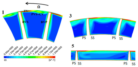 Vorticity in three hub-to-shroud surfaces of the impeller, point P1. PVS—passage vortex at shroud; BVS and BVP—blade surface vortices at SS and PS; CV—Coriolis vortex.